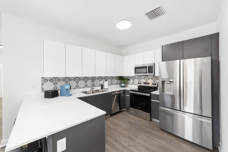 Fully equipped modern kitchen with full-sized fridge, water dispenser, and ice maker
