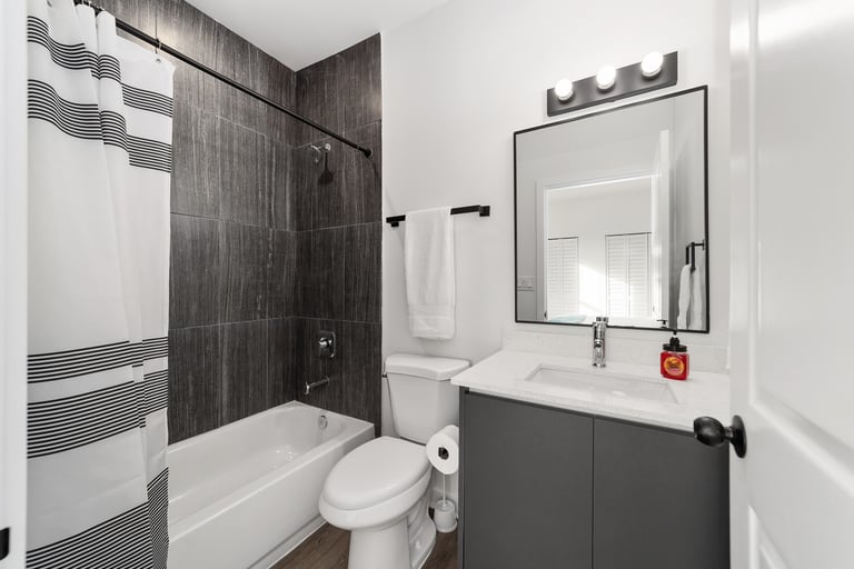 Upscale living spaces featuring private bathrooms with style in a brand-new townhouse just off campus.