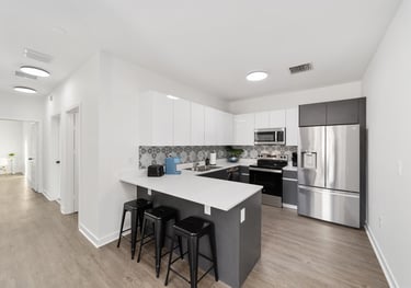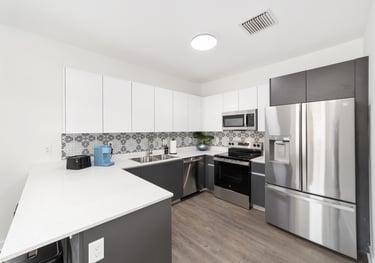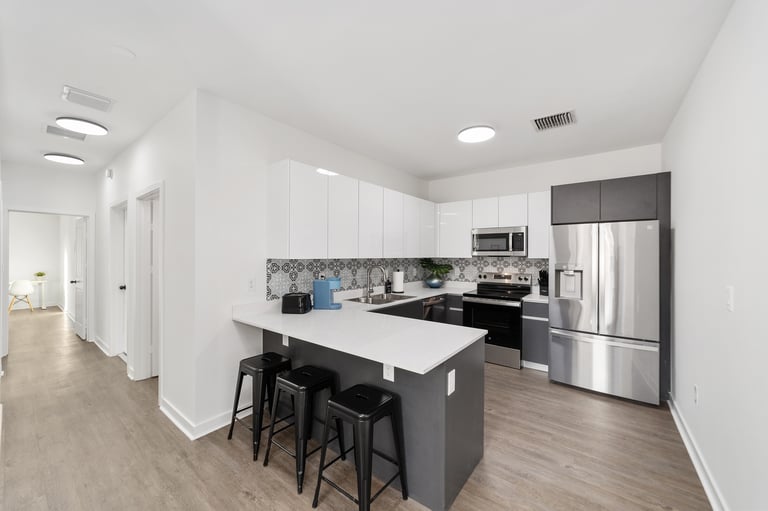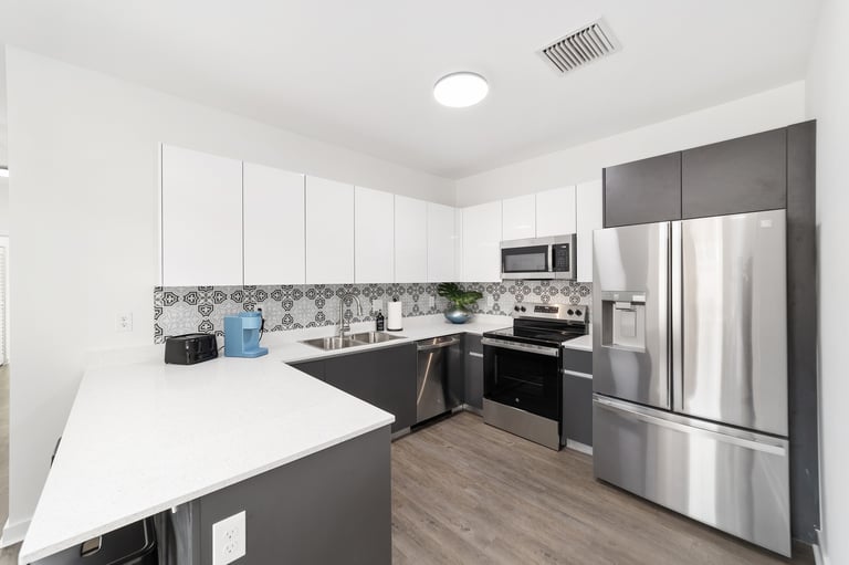 Modern kitchen with full-size fridge, quartz countertops, and plenty of storage